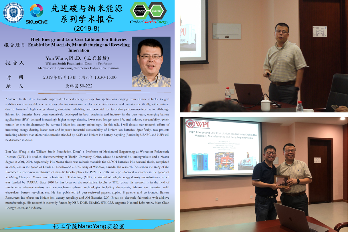 2019年7月13日,伍斯特理工学院机械系王岩教授到访课题组,带来题为“High Energy and Low Cost Lithium Ion Batteries Enabled by Materials, Manufacturing and Recycling”的精彩报告。王岩教授向同学们介绍了其在锂离子电池以及电池回收方面的研究工作与成果,详细分享了如何实现锂离子电池的高储能、低成本以及可持续发展的目标。王教授和同学们分享了他科研与创业的心路历程,以及他是如何做到用最短的时间完成了从助理教授到教授的经历,鼓励同学们应该以应用为导向,做出真正有价值有意义的工作。