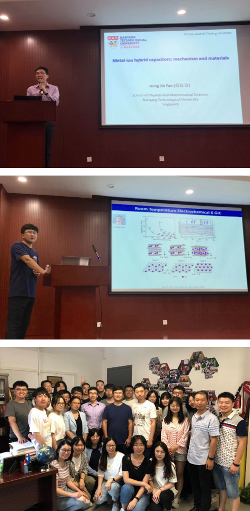 2019年6月18日,美国俄勒冈州立大学纪秀磊教授、新加坡南洋理工大学范红金教授到访Nanoyang课题组,分别带来题为“The properties carbon-based materials as electrodes”和“Metal-ion hybrid capacitors: mechanism and materials”的精彩报告。报告吸引了我校相关领域众多师生前来聆听学习。