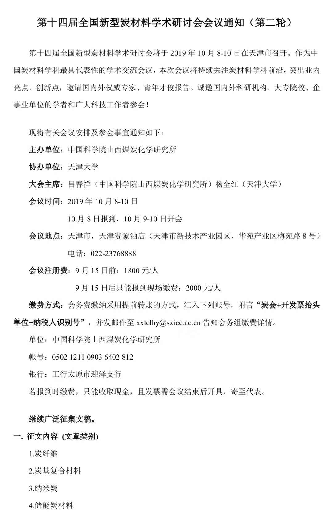 第十四届全国新型炭材料学术研讨会将于2019年10月8-10日在天津市召开。作为中国炭材料学科最具有代表性的学术交流会议,本次会议将持续关注炭材料学科前沿,突出业内亮点、创新点,邀请国内外权威专家、青年才俊报告。