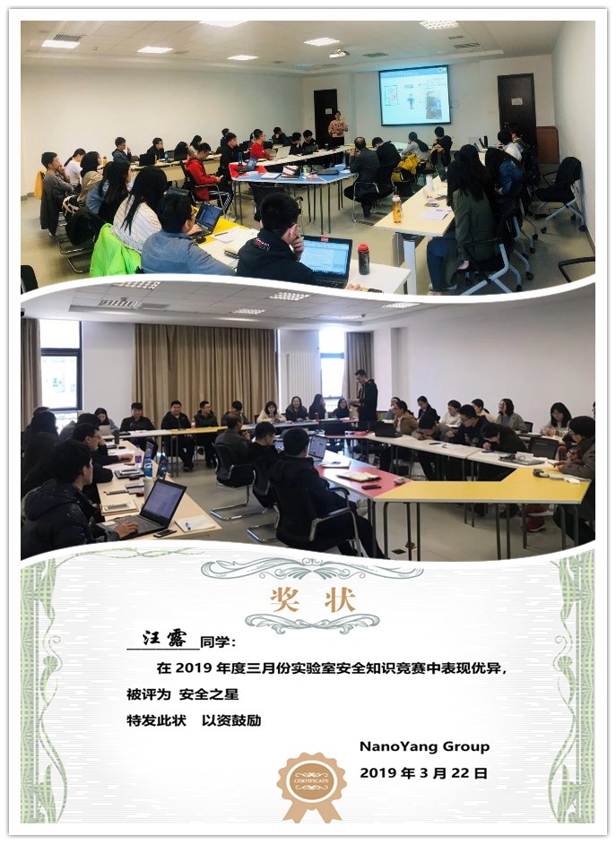 安全培训之后,为了使同学们真正地将安全知识内化于心,课题组全体同学进行了实验室安全知识趣味竞赛。汪露同学获得一等奖;李琦、孟蓉炜、赵子云和尚童鑫四位同学获得二等奖。课题组对上述同学进行了表彰。