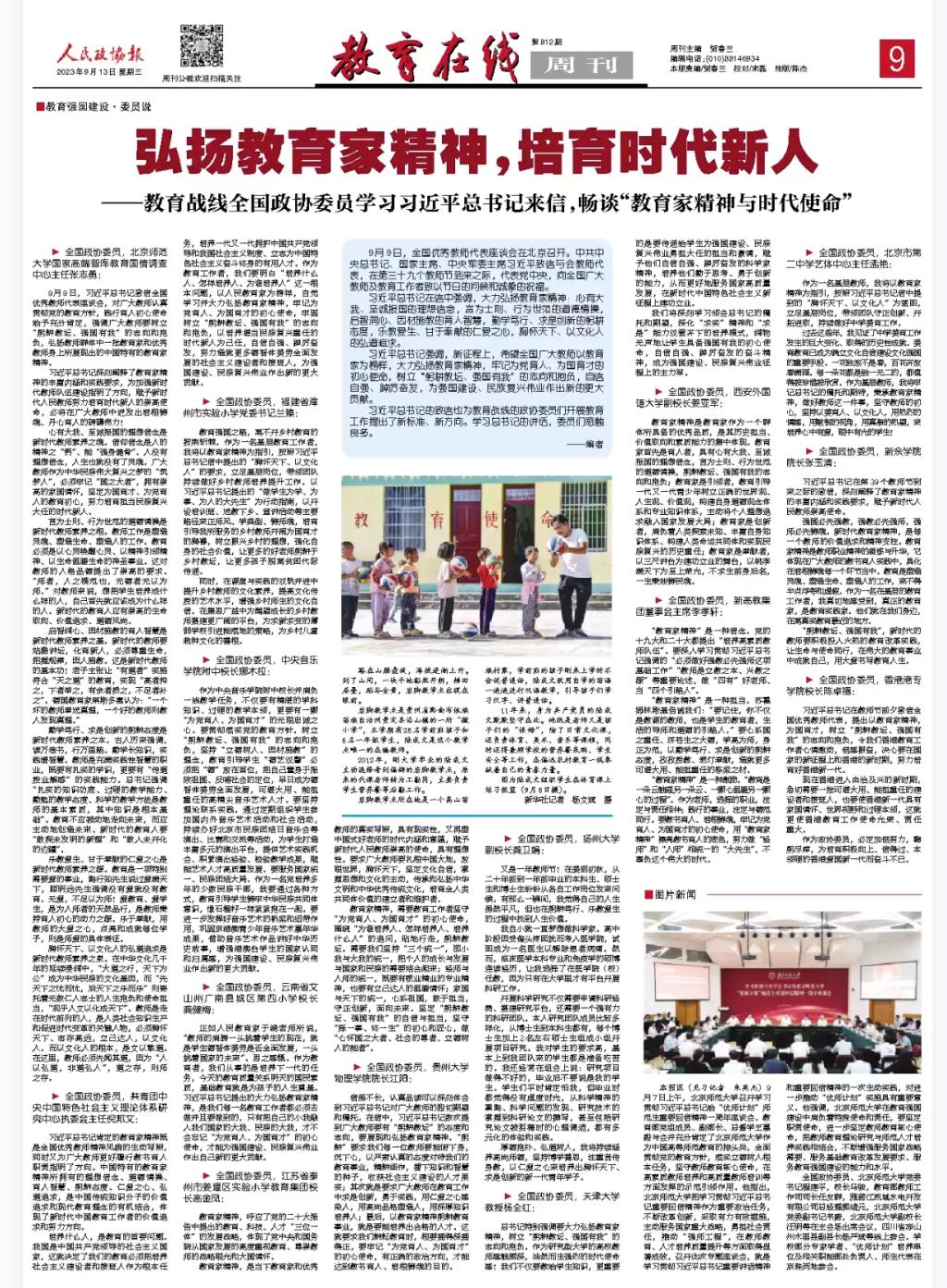 习近平总书记致信全国优秀教师代表在全国政协委员中引起热烈反响,教育战线全国政协委员学习习近平总书记来信后,让躬耕教育战线的全国政协委员深感温暖,备受鼓舞,畅谈“教育家精神与时代使命”。全国政协委员杨全红教授在学习讲话之后表示:“作为研究型大学的高校教师感触颇深,油然而生强烈的时代使命感!我们不仅要教给学生知识,更重要的是要传递给学生为强国建设、民族复兴伟业勇担大任的担当和豪情,赋予他们自信自强、踔厉奋发的科学家精神,培养他们勤于思考、勇于创新的能力,从而更好地服务国家高质量发展,在新时代中国特色社会主义新征程上建功立业。我们将深刻学习领会总书记的嘱托和期望,深化“求实”精神和“求是”能力双管齐下的培养模式,润物无声地让学生具备强国有我的初心使命,自信自强、踔厉奋发的奋斗精神,成为强国建设、民族复兴伟业征程上的主力军。”
