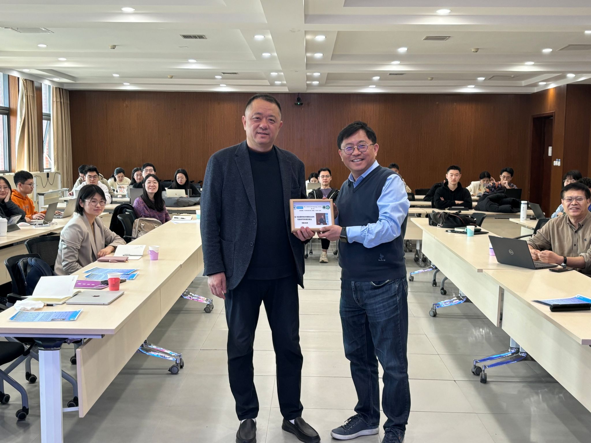 邢老师的报告不仅深入了同学们对电解水前沿的了解,还丰富了对氢-电能量转换关键催化材料的科学认识。最后,由杨老师为邢老师送上讲座现场照片留念。