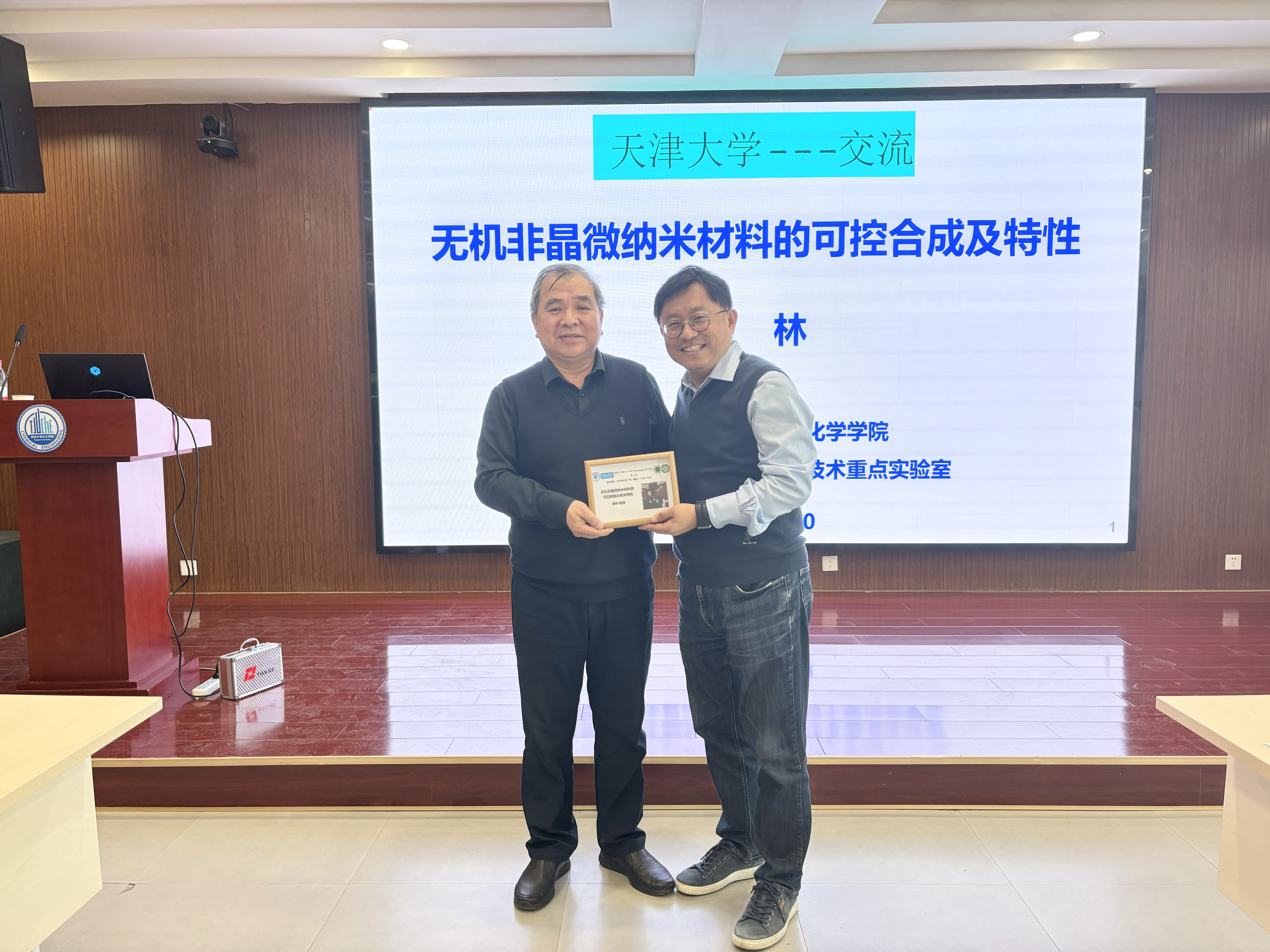 郭老师的报告不仅拓宽了同学们对无机非晶微纳米材料前沿领域的认知,还丰富了对材料的催化、力学、光学等特性及潜在应用的科学思考。最后,由杨老师为邱老师送上讲座现场照片留念。