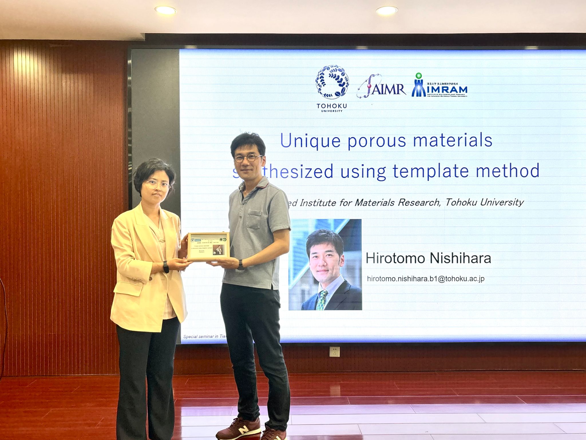 Nishihara教授的报告不仅拓宽了同学们对碳材料前沿领域的认知,还丰富了对材料的合成、力学等特性及潜在应用的科学思考。最后,由陶莹老师为Nishihara教授送上讲座现场照片留念。