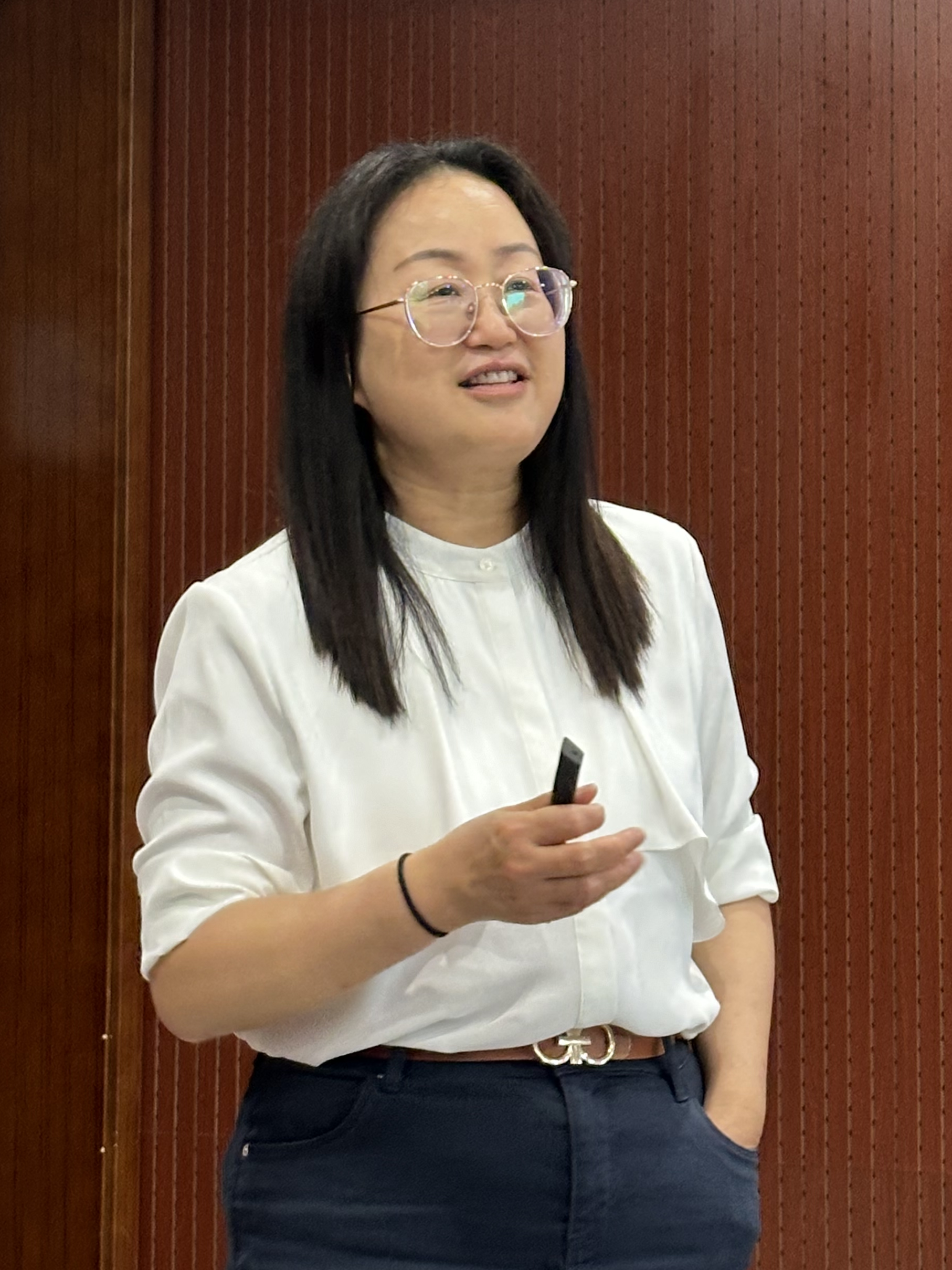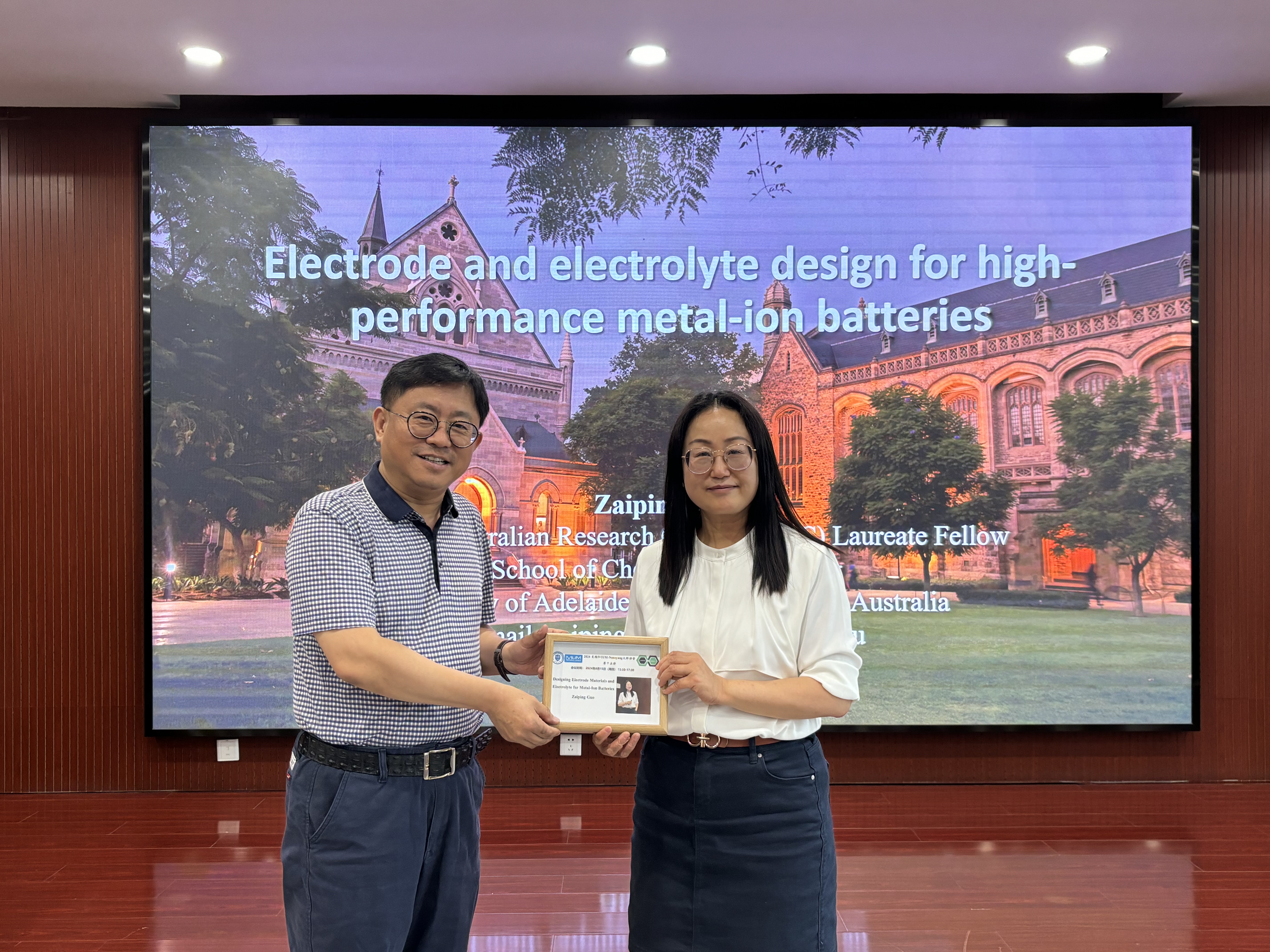 郭老师的报告不仅深入了同学们对电化学储能前沿的了解,还丰富了同学们对锂离子和锌离子电池的科学认识。最后,由杨老师为张老师送上讲座现场照片留念。