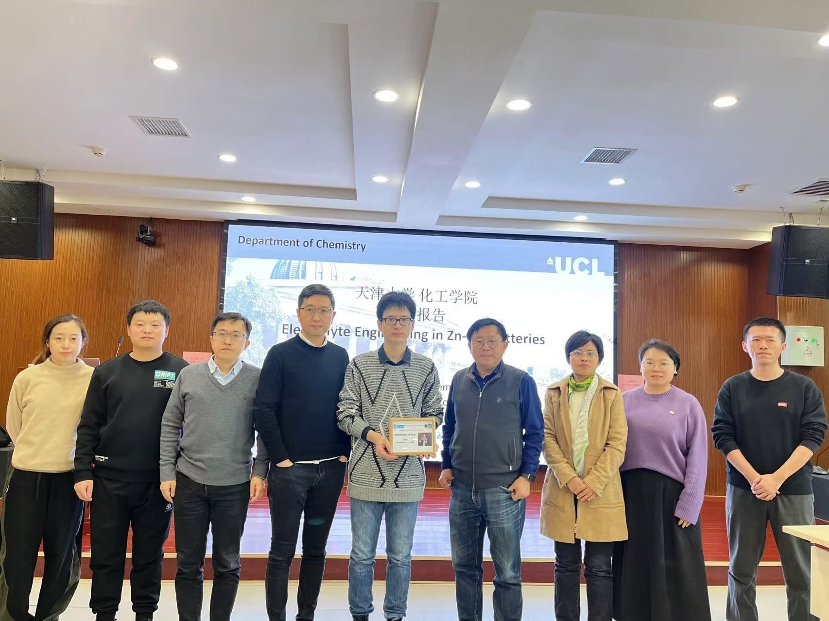 何老师的报告不仅详细介绍了水系锌离子电池目前的研究进展,还展望了未来的发展方向,加深了同学们对水系锌离子电池的了解,最后,由杨老师为何老师送上讲座现场照片留念。