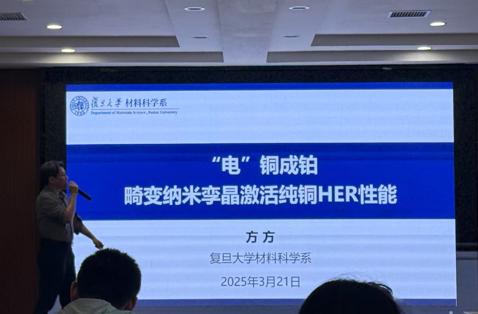 复旦大学方方教授带来了题为《“电”铜成铂一畸变纳米孪晶激活纯铜HER性能》的精彩报告。在电解析氢过程中,催化剂至关重要,它能降低电解反应的活化能,提高析氢反应的速率与效率。铜(Cu)成本低、储量高且导电性优异,是潜在的理想析氢催化剂。然而,Cu 对析氢反应的氢中间体吸附过弱,析氢催化活性差,理论计算表明,引入拉伸应变和降低配位数,可有效增强 Cu 对氢中间体的吸附作用。方老师的研究通过局域结构调控,在降低配位数的同时引入强且稳定的拉伸应变,成为了一种激活纯 Cu 析氢催化活性的手段。