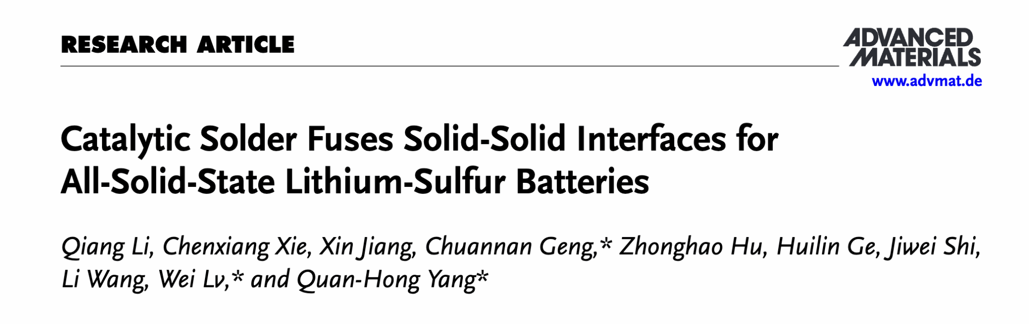 祝贺李强、谢晨翔、江欣的论文“ Catalytic Solder Fuses Solid-Solid Interfaces for All-Solid-State Lithium-Sulfur Batteries”在Advanced Materials上发表。(Adv. Mater. 2025, 2507308)
