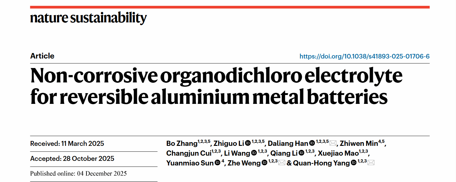 详情可见:Zhang, B., Li, Z., Han, D. et al. Non-corrosive organodichloro electrolyte for reversible aluminium metal batteries. Nat Sustain (2025).https://doi.org/10.1038/s41893-025-01706-6