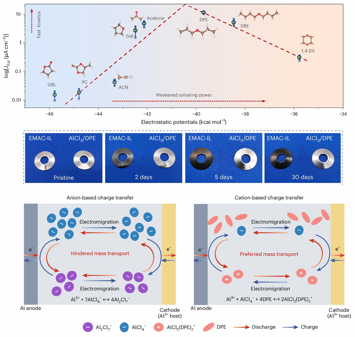 针对这一核心挑战,我们团队创新性地提出“有机双氯”溶剂化电解液设计策略,以氯化铝或正丙醚有机体系替代传统离子液体,并通过精准筛选与调控有机溶剂的溶剂化能力,构建了独特的“有机双氯”溶剂化结构。该结构将所有具有腐蚀性的氯离子(Cl-)“限域”在铝离子(Al³⁺)周围,从而大幅降低了电解液整体的腐蚀性。同时,这一特殊结构易于极化,从而确保了铝电池能够稳定、高效地完成反复的充电与放电循环。
