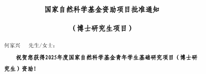 祝贺2023级博士研究生何家兴成功获批2025年国家自然科学基金青年学生基础研究项目(博士研究生)!